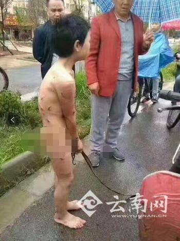 有市民追问摩托车上的男子孩子是否其亲生的,该男子一边给孩子解开绳子一边称是自己的孩子,最后骑车载着孩子离开,现场引发多名市民围观。