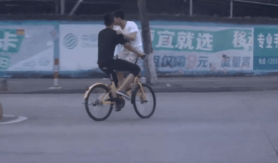 日前,一段双人共骑一辆小黄车的视频在网上曝光。据了解,7月31日,在广东佛山两名男子共骑一辆ofo小黄车在街头穿梭,其中一名白衣男子坐在车头,一名黑衣男子骑车。