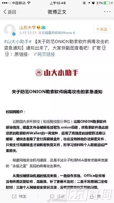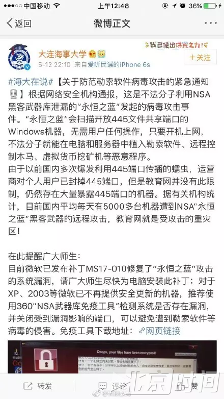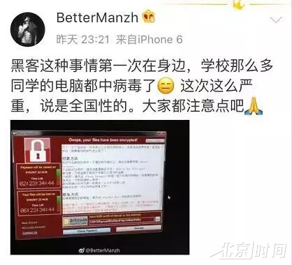 目前病毒还在扩散,令人气愤的是被黑的基本上是大四学生的电脑,论文全部被加密,黑客还扬言给钱就帮恢复论文!