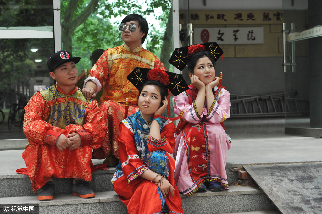 2015年6月1日,山东聊城,聊城大学2011级广播电视新闻系毕业生身着古装在校园内拍摄毕业照。