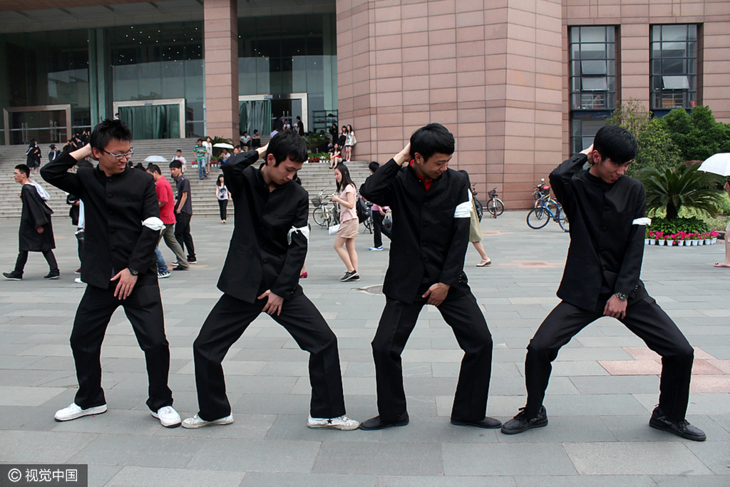 2014年6月9日,青岛大学西院内,即将毕业的商学院大四学生身穿西装和礼服拍摄另类的青春毕业照。 男生穿上中山装模仿叶问,女生穿着礼服也来凑热闹。