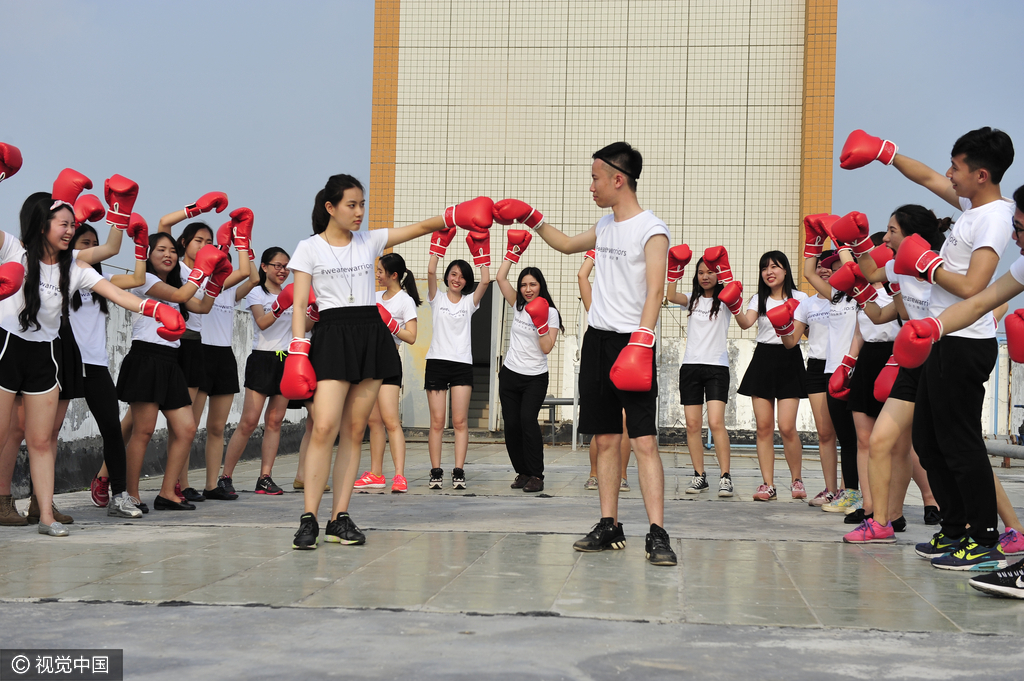 2015年04月29日,广州大学城广东外语外贸大学的毕业生穿上拳击手装扮,寓意着在人生的赛场上永远都是斗士。