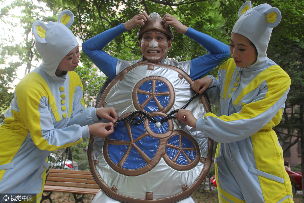 2014年7月11日,山东聊城大学外国语学院大学生与教职工儿童一起拍创意照片“我们去旅行”。