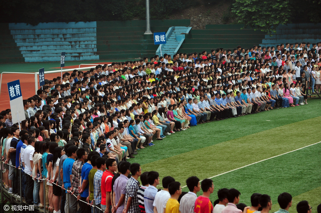 2014年6月5日,湖北省武汉市,华中师范大学2014届名毕业生在该校佑铭体育馆操场上,围成半径45米的圆弧进行毕业合影。 华中师范大学2014届4000多名毕业生一起配合,完成这难以忘却的毕业留影。