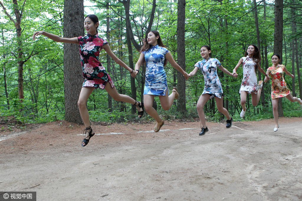 2015年05月21日,河南洛阳,龙峪湾国家森林公园,5名女大学生身着旗袍,在丛林间施展“凌波微步”。