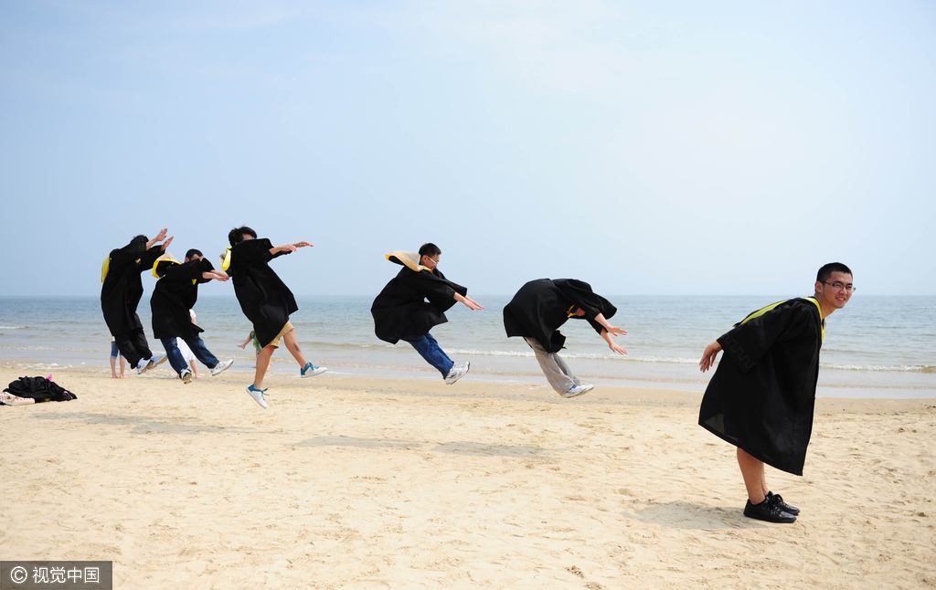 2013年06月08日,山东省烟台市,在烟台大学海水浴场,应届毕业大学生拍照留念。