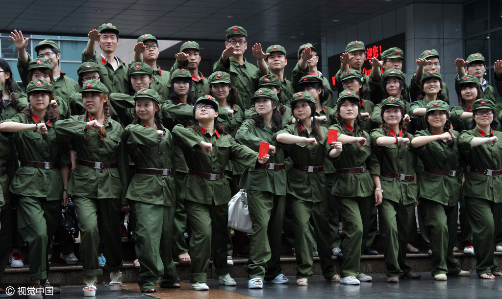 2012年6月6日,武汉,华中师范大学的一群毕业生身着“红卫兵”服装,手拿“红宝书”在校园里拍摄毕业照。