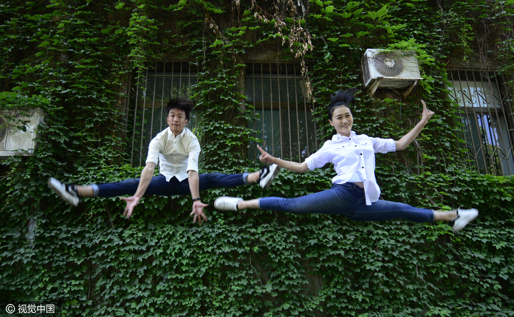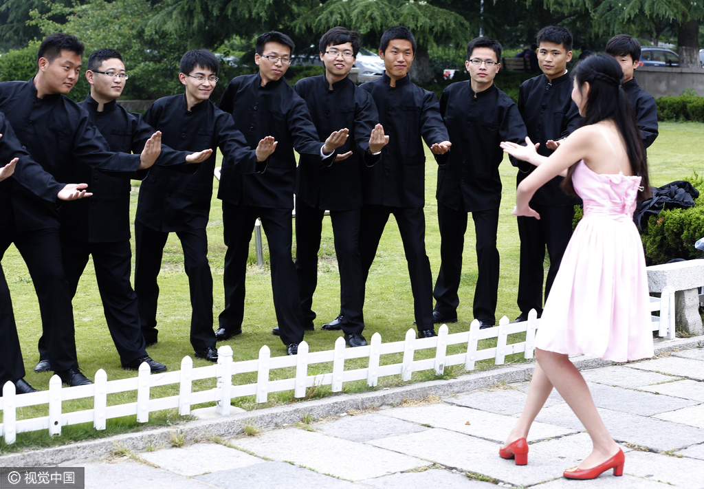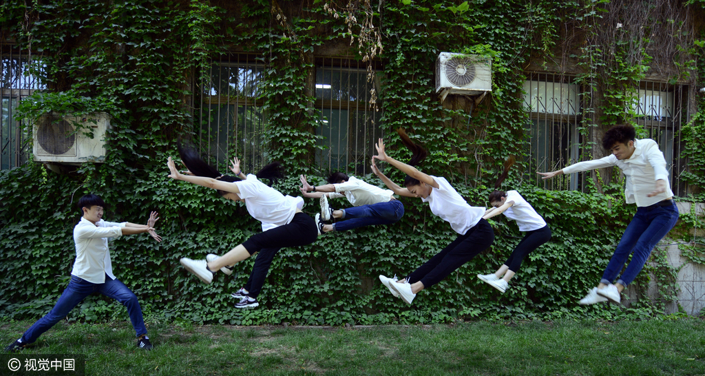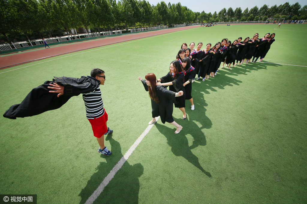 2014年6月23日,山东青岛,中国石油大学(华东)2014届毕业生在校园里拍摄个性毕业照,纪念他们逝去的青春岁月。