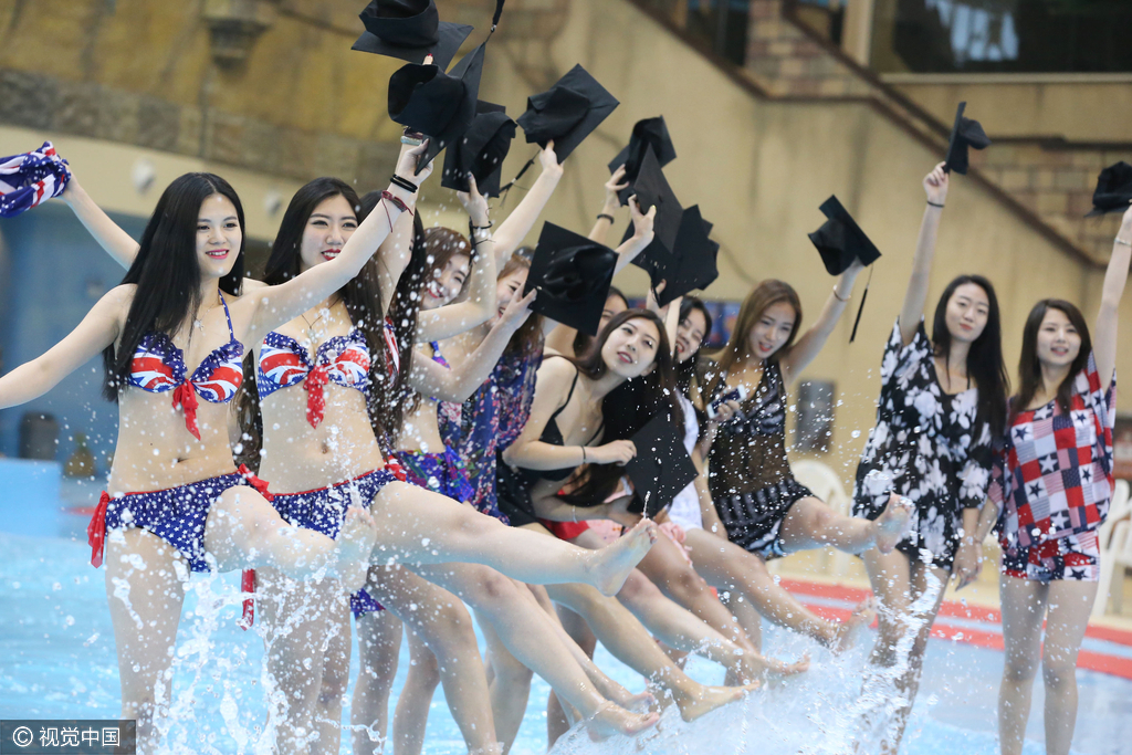 2016年5月15日上午,山东烟台,十几名山东工商学院等高校的毕业生来到烟台37°梦幻海水乐园,拍摄比基尼毕业照。