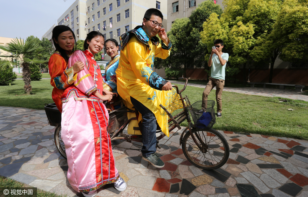 2014年05月27日,河南省郑州市,河南农业大学校园异常热闹,一批由毕业生导演的宫廷大戏上演,各种搞怪合影,各种爆笑穿越,以此作为毕业留念。其中,“皇上”骑三轮车带“娘娘”兜风成为一大亮点。