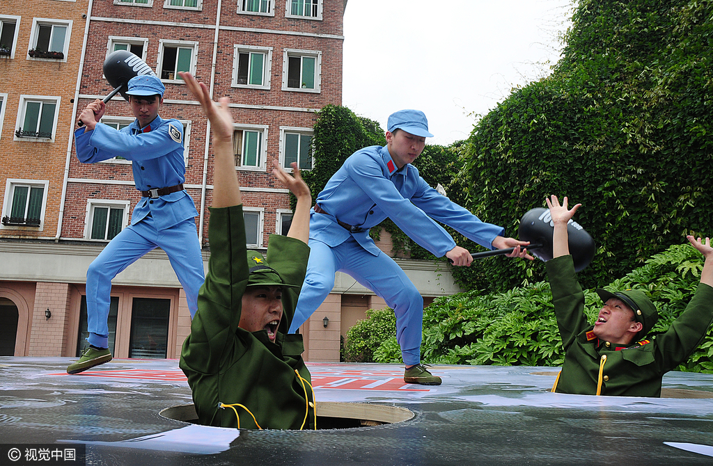 2015年5月17日,浙江杭州,杭州乐园为大学生举办了一场纪念中国抗日战争胜利70周年的个性毕业礼。 大学生们在游戏“打地鼠”中打大学生扮演的“鬼子”。