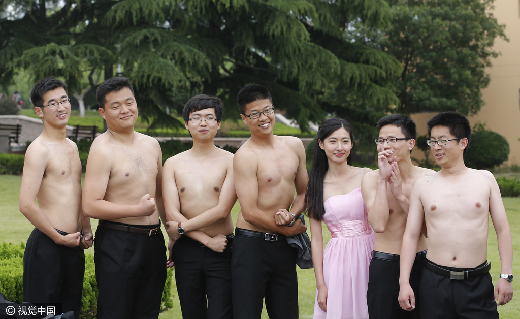 2014年6月9日,青岛大学西院内,即将毕业的商学院大四学生身穿西装和礼服拍摄另类的青春毕业照。 男生们脱去上衣展示肌肉,女同学成为其中亮点。
