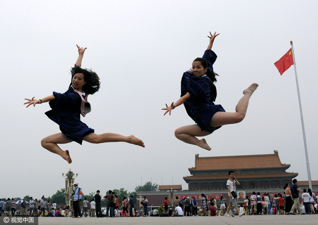 2014年06月19日,北京天安门广场,几名来自京城某大学即将毕业的女学子们摆出各种创意造型拍照留影,成为一道充满青春活力的风景,吸引了过往游客的目光。