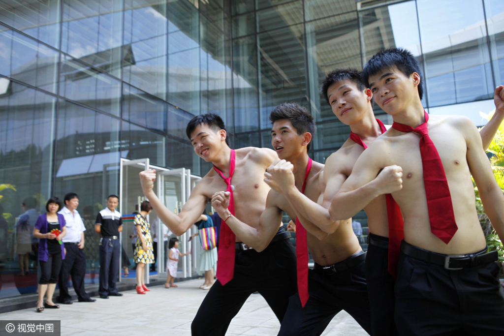 2012年5月14日,广东惠州学院体育馆外,几名体育系的毕业生脱去了上衣,只戴着领带在女生面前拍照。