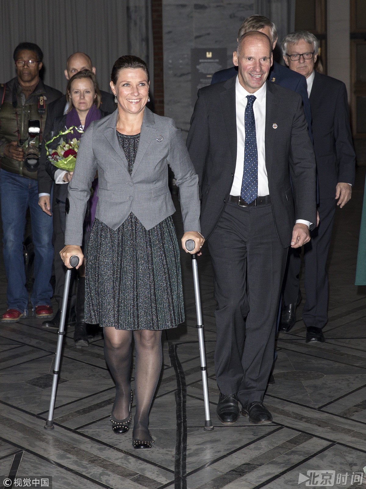 当地时间2017年11月17日,挪威奥斯陆,挪威公主玛莎·路易丝拄拐杖出席奥斯陆市政厅举行的听力障碍协会100周年纪念活动。