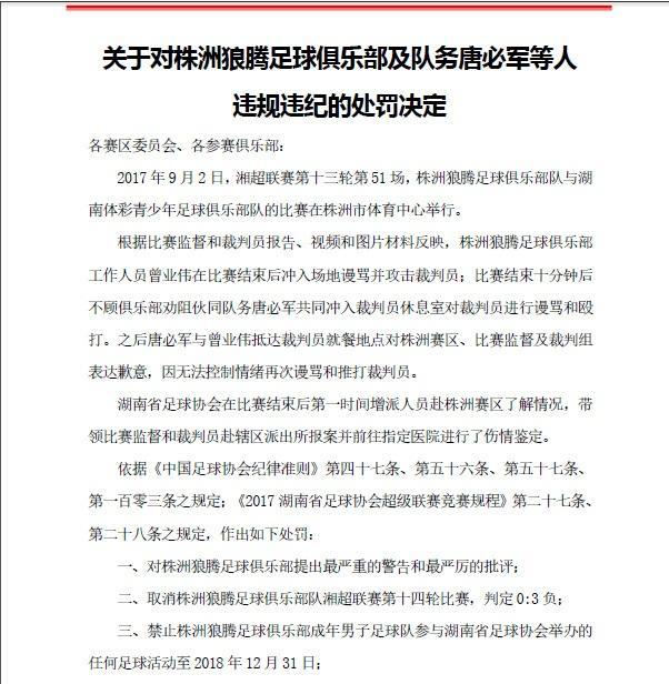 在湘超联赛第13轮株洲狼腾与湖南体彩的比赛中,株洲狼腾俱乐部工作人员曾业伟和队务唐必军在比赛结束后冲入裁判员休息室对裁判员进行辱骂和殴打。