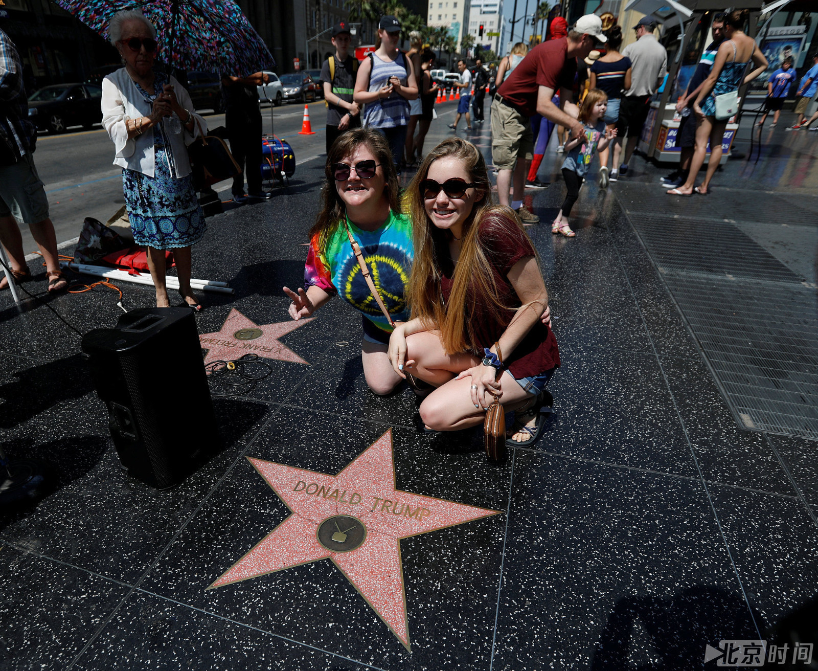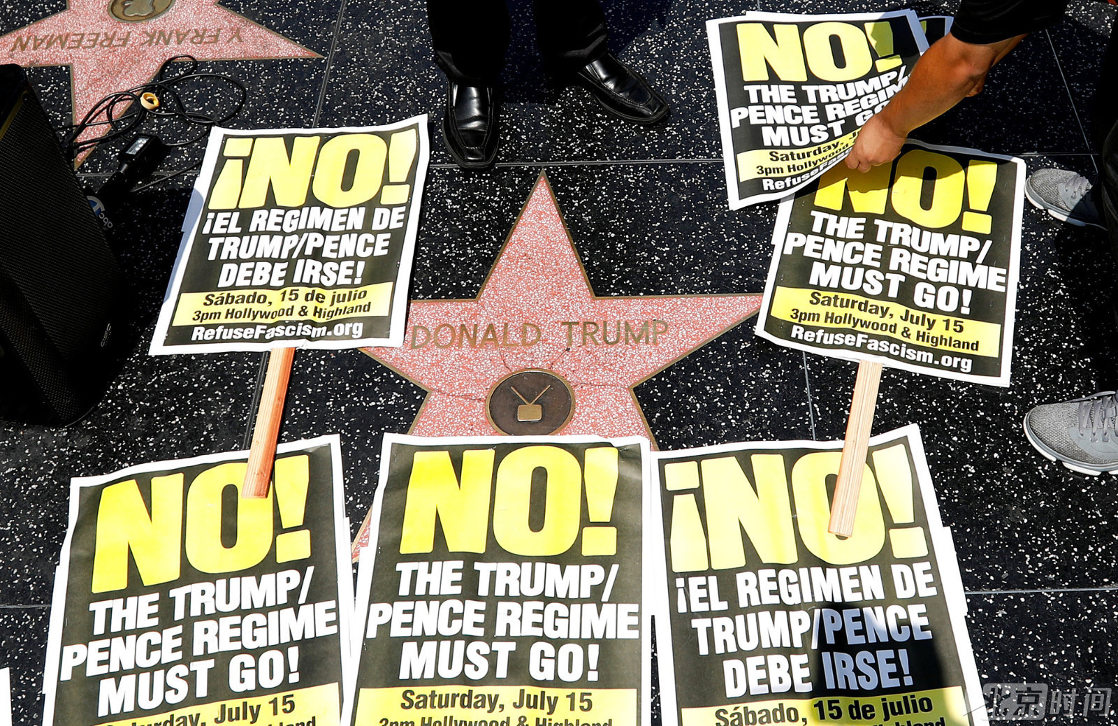 当地时间2017年7月10日,美国洛杉矶,活动家在好莱坞星光大道上的“特朗普之星”上贴满标语宣布进行全国范围内的抗议。