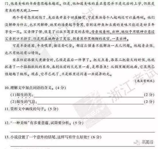 文章描写主人公6岁时,一家人第一次喝鱼汤发生的故事。文章最后写道,从锅里跳出来的鱼"眼里还闪着一丝诡异的光"。