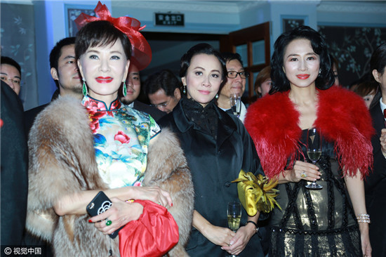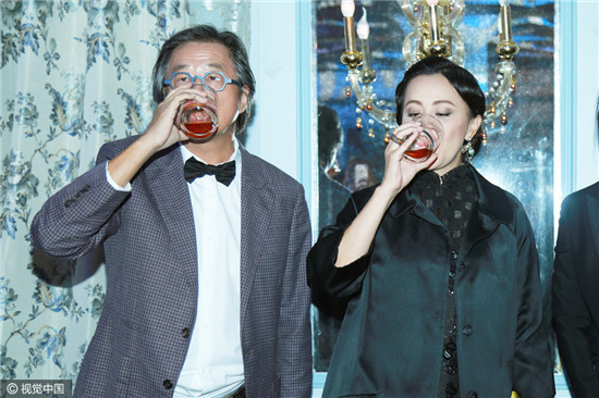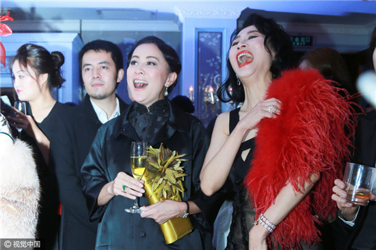 26日,王伟忠复古生日party举行。刘嘉玲黑衣贵妇造型现身,举杯一饮而尽张嘴大笑显豪气。