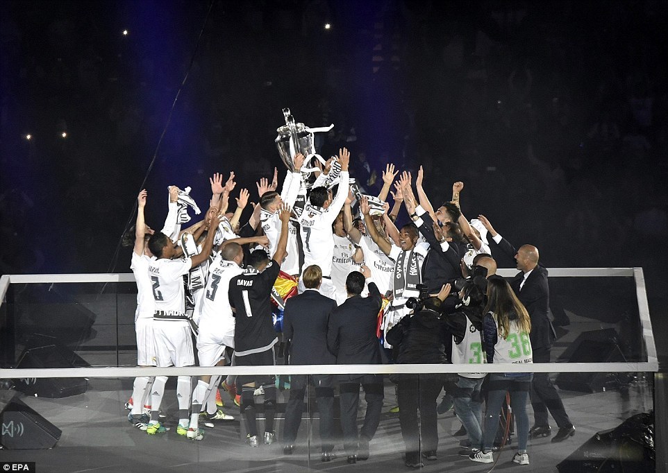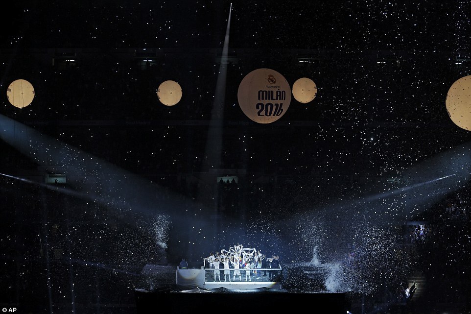 皇家马德里在球队主场圣地亚哥-伯纳乌球场举办欧冠夺冠庆典,庆祝夺得历史第11座欧冠奖杯。