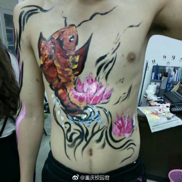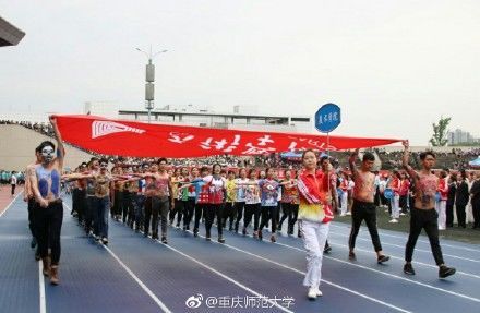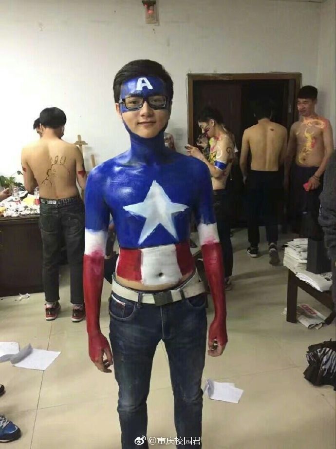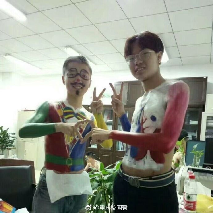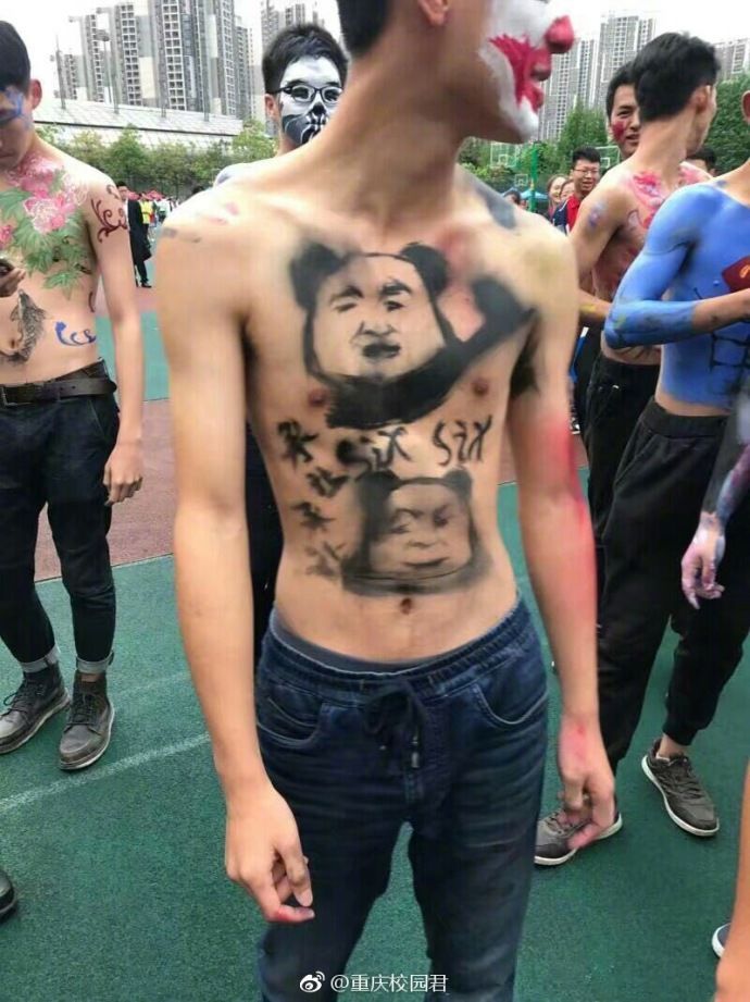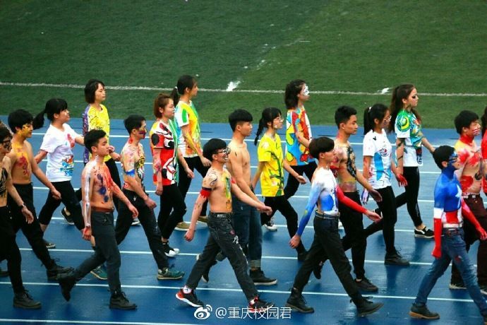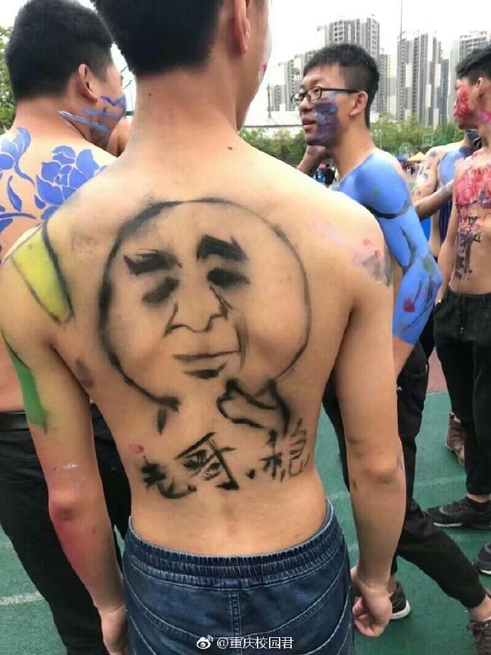 看,迎面走来的是表情包方队,只见一群男生裸着上身,带着神奇的表情包,雄赳赳,气昂昂的向我们走来!