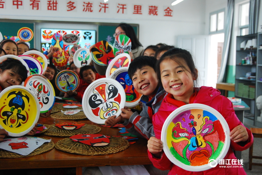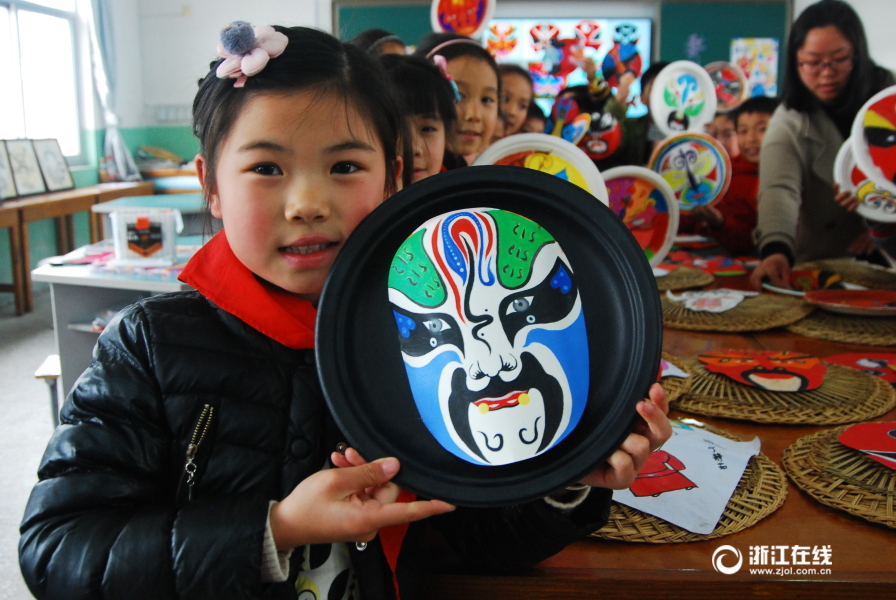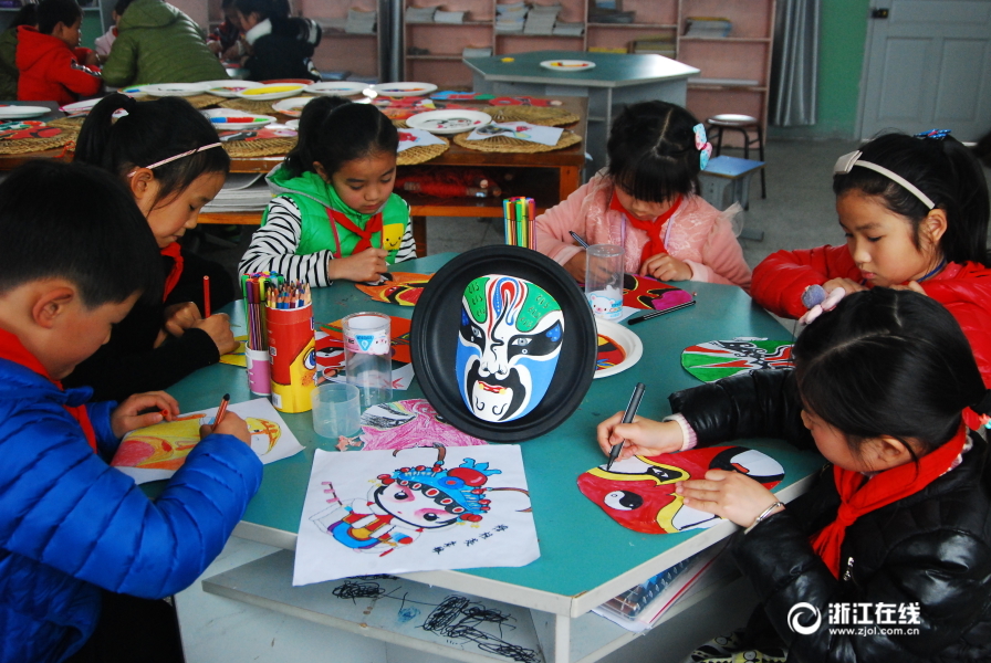 2月20日,建德市新安江第三小学婺韵墨坊社团30多名孩子在美术老师指导下,根据婺剧人物的个性、特点,分别用鲜艳的色彩,将婺剧脸谱栩栩如生地呈现在纸上。