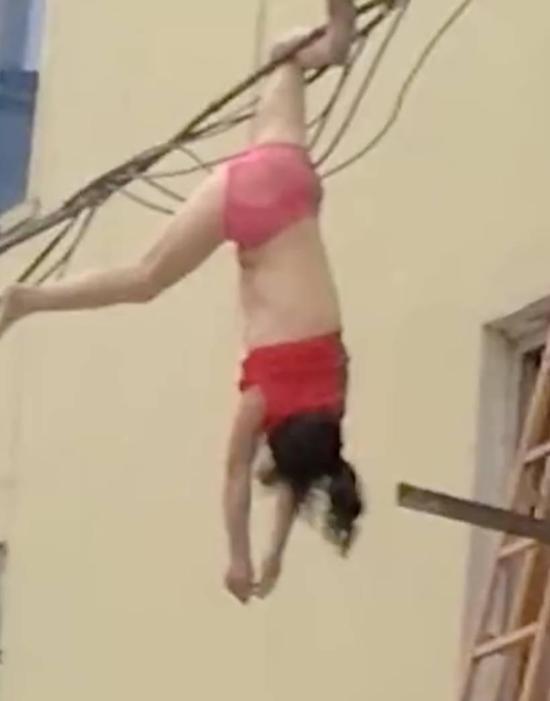 7月1日上午9点30分,辽宁本溪消防支队明山中队接到报警,位于紫金路一小区一名只穿着内衣裤的女子倒悬在一幢居民楼前二三楼之间的电缆线上。