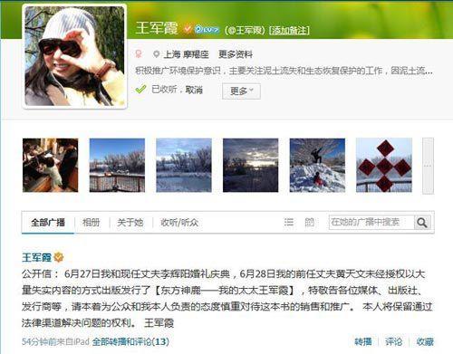 王军霞6月30日通过微博发表的声明,她在公开信中说:“6月28日我的前任丈夫黄天文未经授权以大量失实内容的方式出版发行了《东方神鹿———我的太太王军霞》,特敬告各位媒体、出版社、发行商等,请本着为公众和我本人负责的态度慎重对待这本 书的销售和推广。本人将保留通过法律渠道解决问题的权利。”
