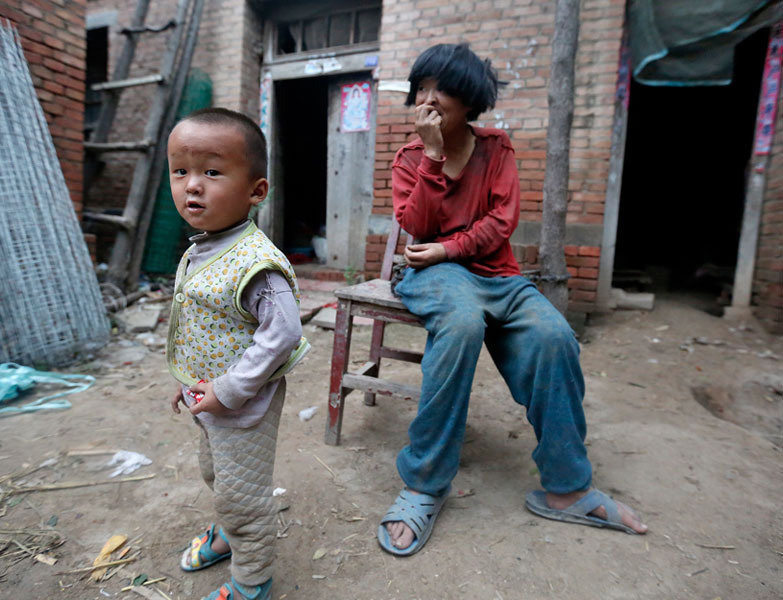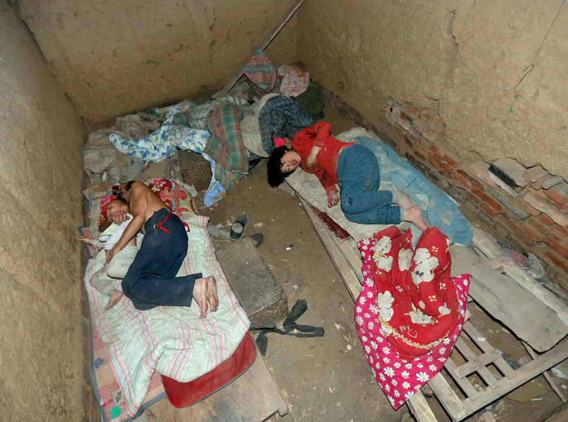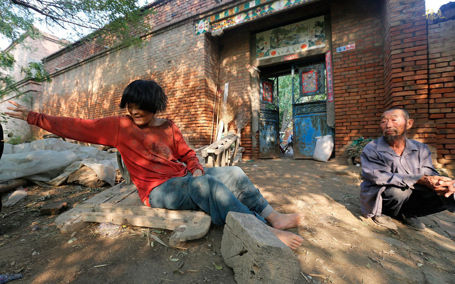 王孟义下地干活时,不得不将女人锁在屋里,把儿子栓在特制的木桩上,“怕他们丢了,找不到。”