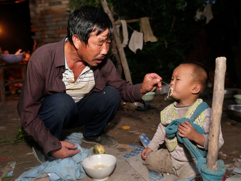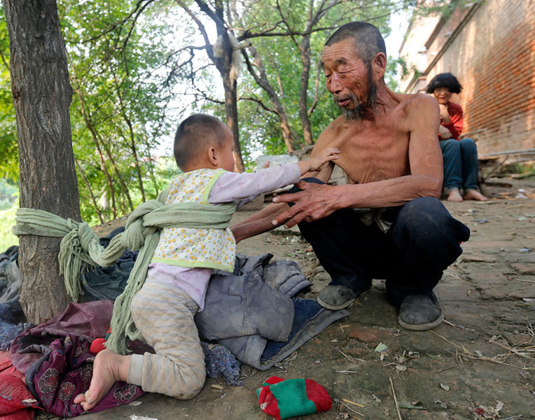 老人照顾21岁智障妻子和3岁儿子 将儿子拴木桩_北京时间
