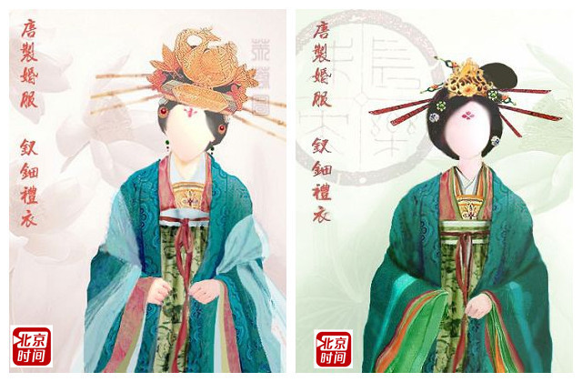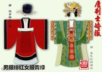 唐朝经济文化的空前强盛,以至民风开放,服饰色彩艳丽缤纷。唐制婚礼服在秦汉时期庄重神圣基础上融合了富丽喜庆的唐代民风,展现了唐制婚 礼服的独特魅力。婚礼服色彩上“男服绯红,女服青绿”。男服色彩起源于准庶人着绛纱袍迎亲的先例,基本款式似于梁冠礼衣,圆领袍,宽袖大裾,头戴幞头,腰部革带 束衣,脚穿长勒靴。“钗钿礼服”是唐朝女子礼服,因其隆重正式,色彩绮丽,常在重要场合穿着,妇女的短襦都用小袖,下着紧身长裙,裙腰高系,一般都在腰部以上,有的甚至系在腋下,并以丝带系扎,给人一种俏丽修长的感觉。自居易在《霓裳羽衣舞歌》中咏道;“红裳霞帔步摇冠,钿璎累累佩珊珊”,让人感叹新嫁娘的摇曳多姿。