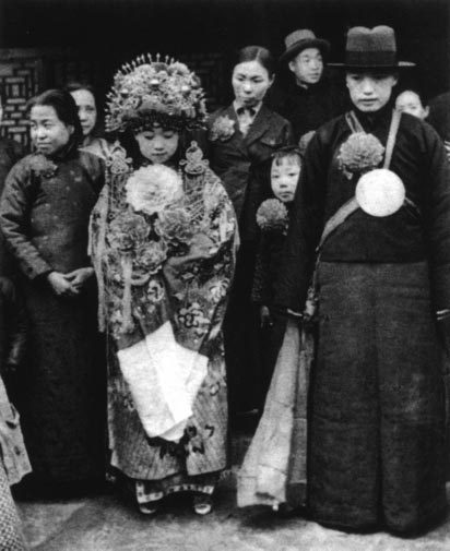 20世纪20年代以后,婚礼服百花齐放,城市富贵人家女子结婚仿照西方婚服,头披自纱,身着丝织礼服,手持白色花束,举行”文明”的结婚仪式;而普通女子仍然穿红袄戴珠冠, 乘坐红轿,脚穿绣花鞋,保持着旧式风俗。