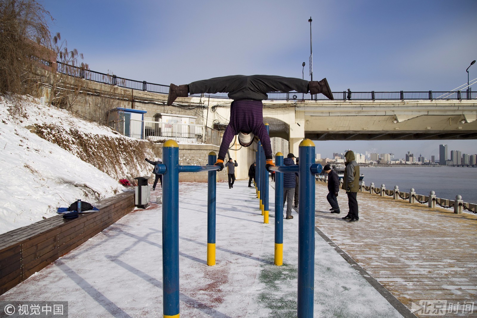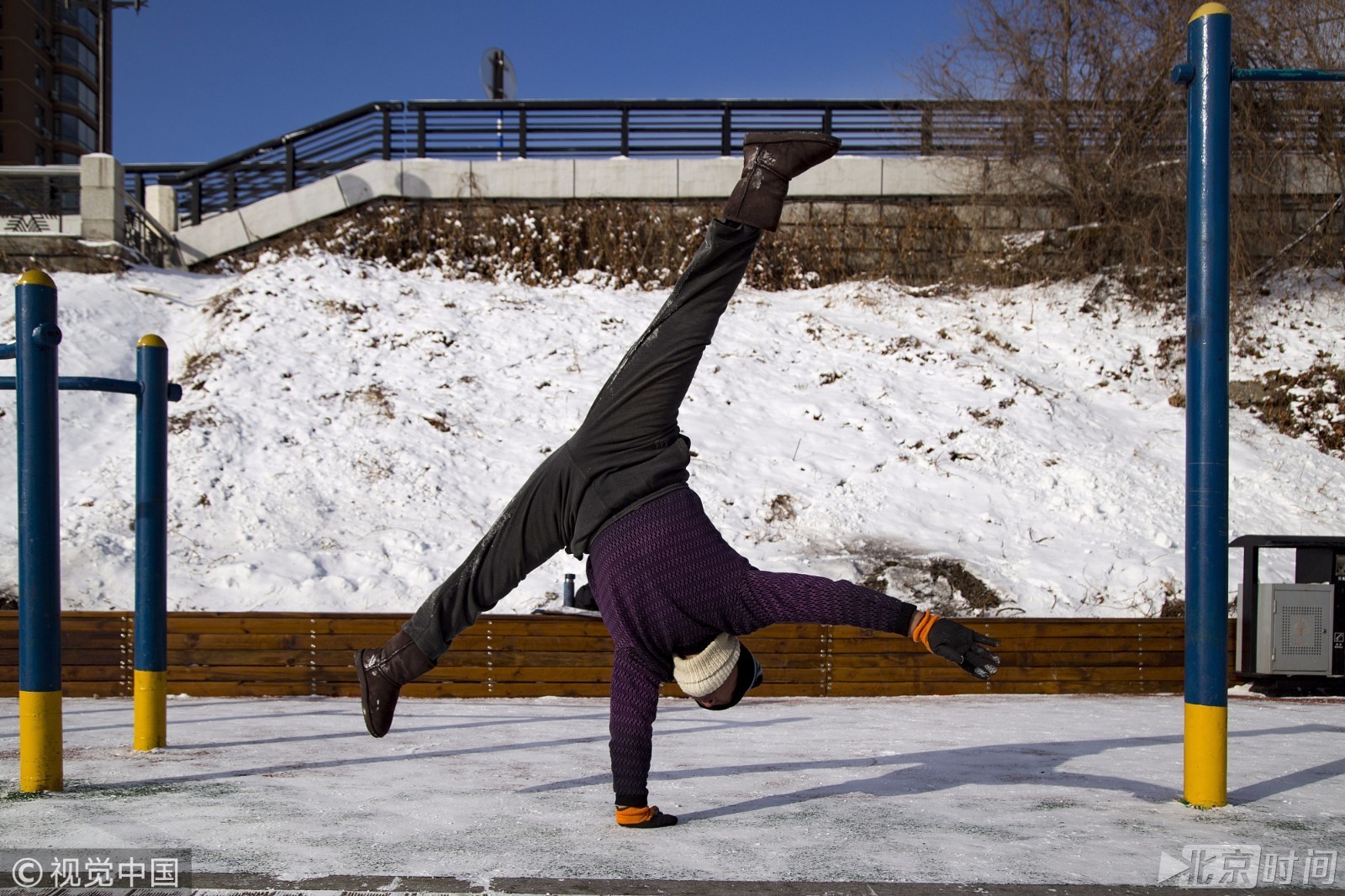 吉林市一位老人在松花江畔健身器材场地进行高难度的健身活动。