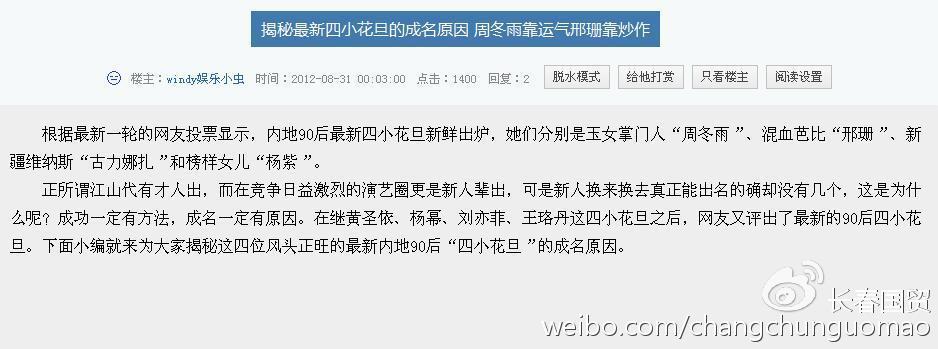 紧接着,在由“网友”投票评选的新四小花旦中(没有查到是哪儿组织的这个活动),邢珊与周冬雨、古力娜扎、杨紫同时入选,邢珊在四个人中排名第二。当时就有网友指出邢珊是靠炒作。