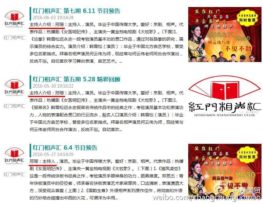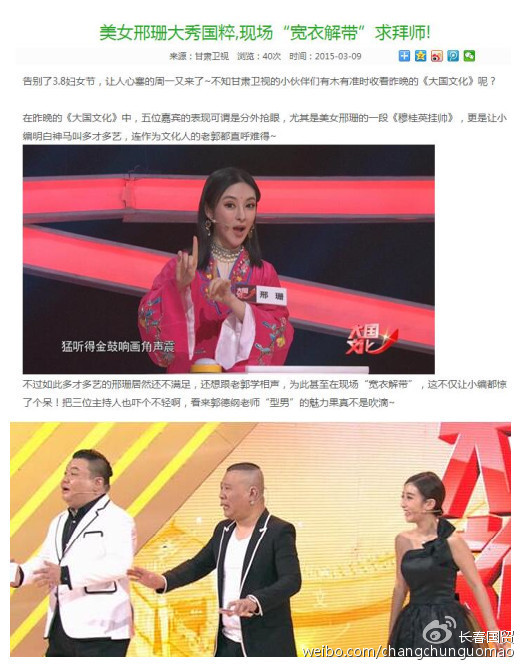 长春国贸仔细查了一下,邢珊和郭德纲的唯一一次交集是在某卫视的一档节目录制中,当时郭德纲是主持人,邢珊是嘉宾。唱了一段京剧得到赞赏,邢姑娘见状遂现场“宽衣解带”求拜师,吓得老郭花容失色。
