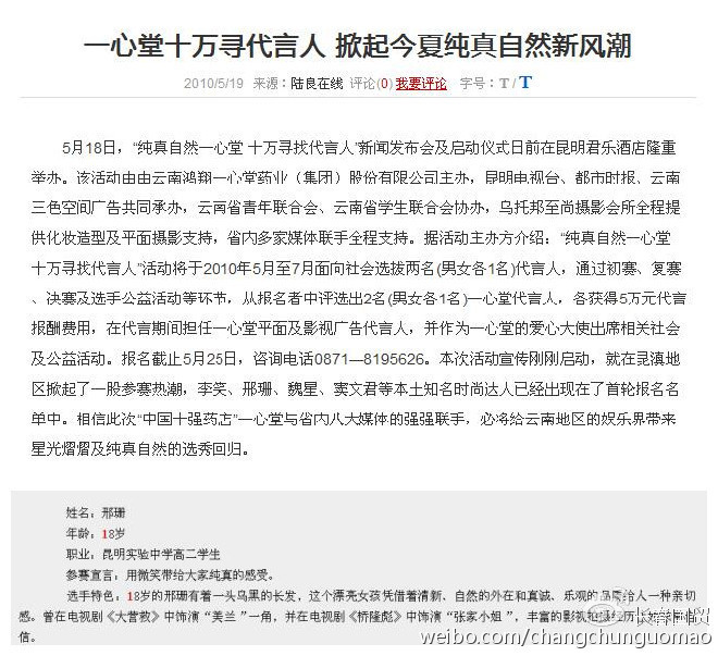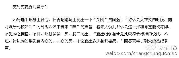 2010年,在昆明实验高读高二的邢珊参加了某企业主办的十万寻找代言人活动,虽然没有进入十强,但在回答评委“笑时究竟露几颗牙?”的问题时也赚足了眼球。