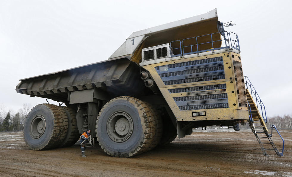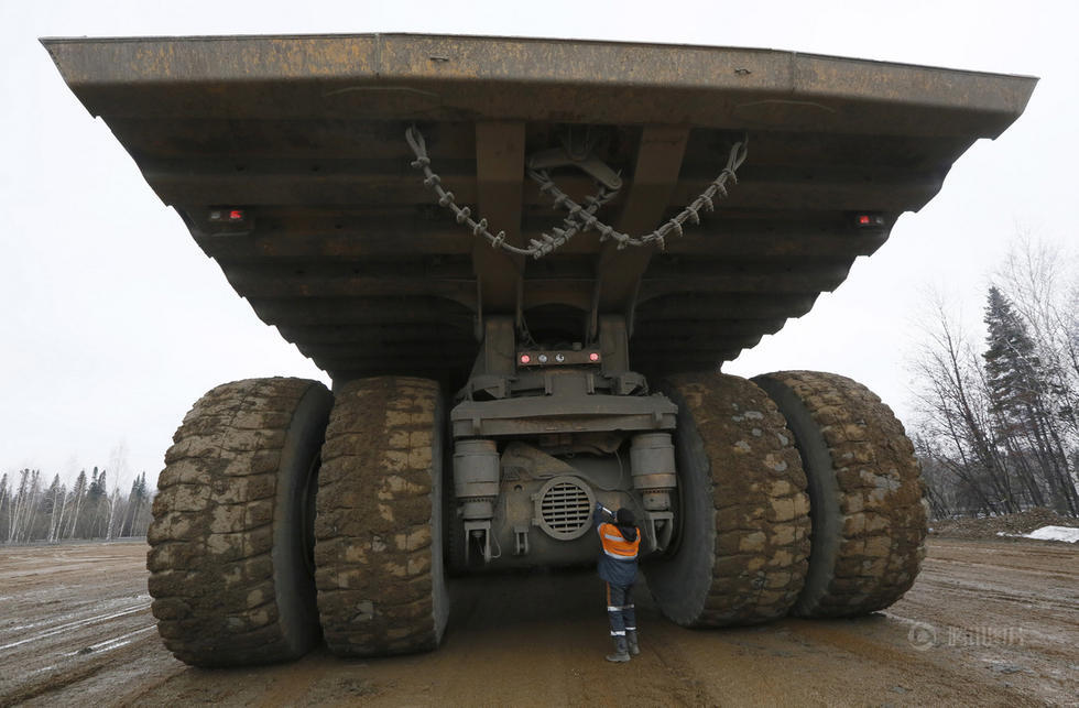 4月4日,在俄罗斯西伯利亚克麦罗沃州Chernigovets大型露天煤矿,一名工人在别拉斯-75710型自卸车旁检查。别拉斯-75710是世界上最大的自卸车,由白俄罗斯制造,于2015年上市销售,可载重450吨,相当于300辆福特福克斯或37层双层巴士。