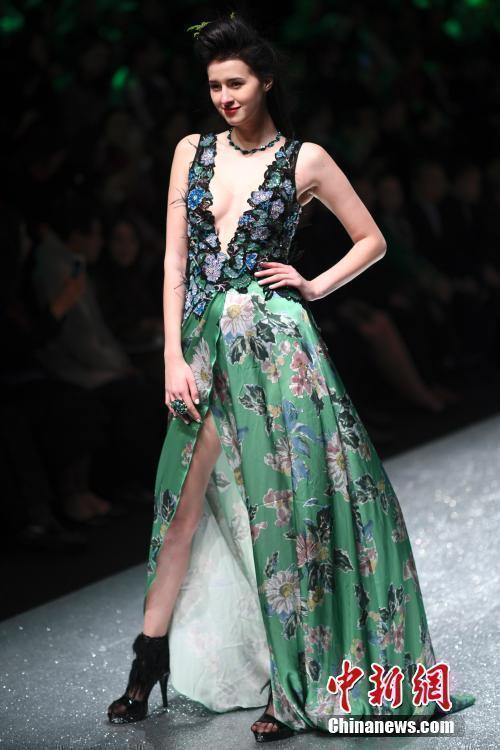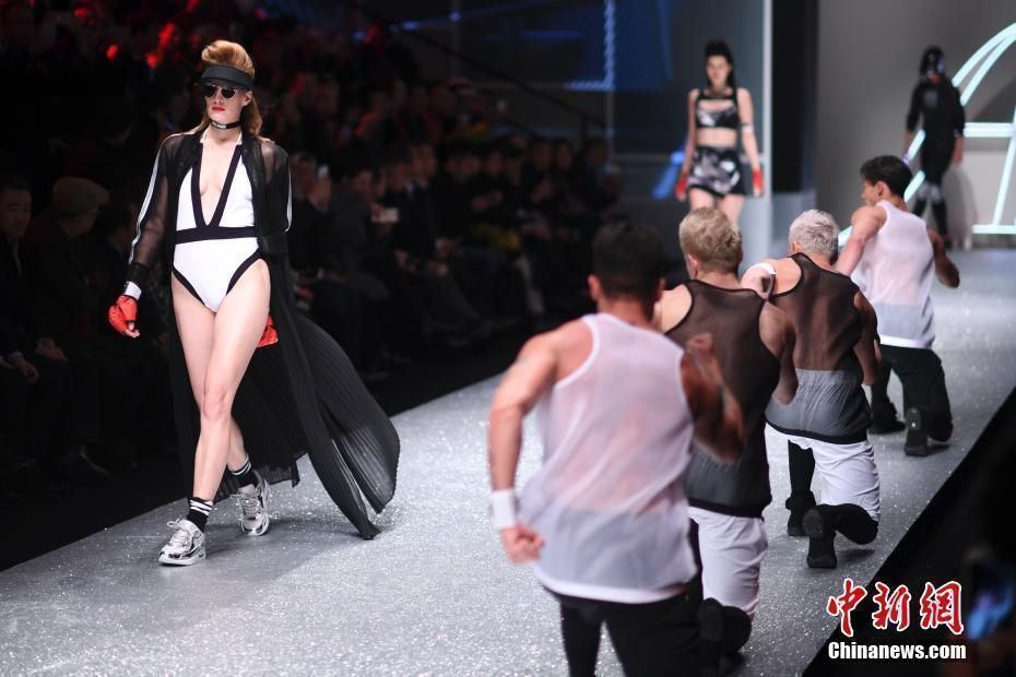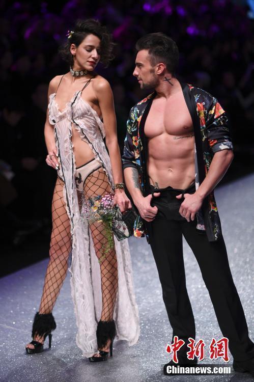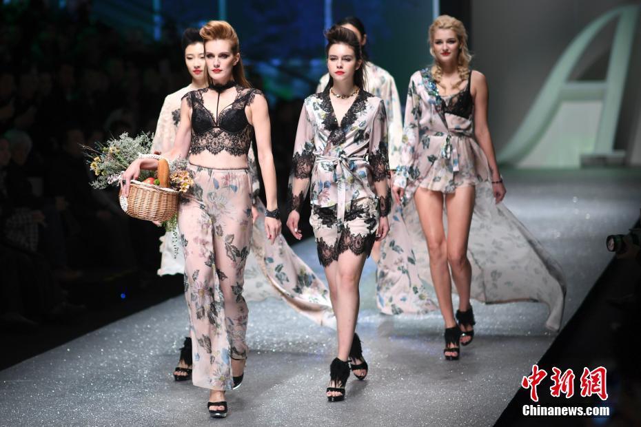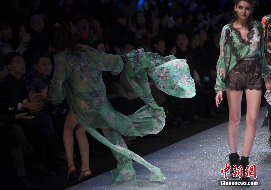 10月30日晚,中国国际时装周舞台上演内衣秀,现场一名模特在T台上展示时装时失误“掉下”T台。