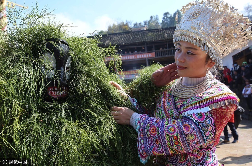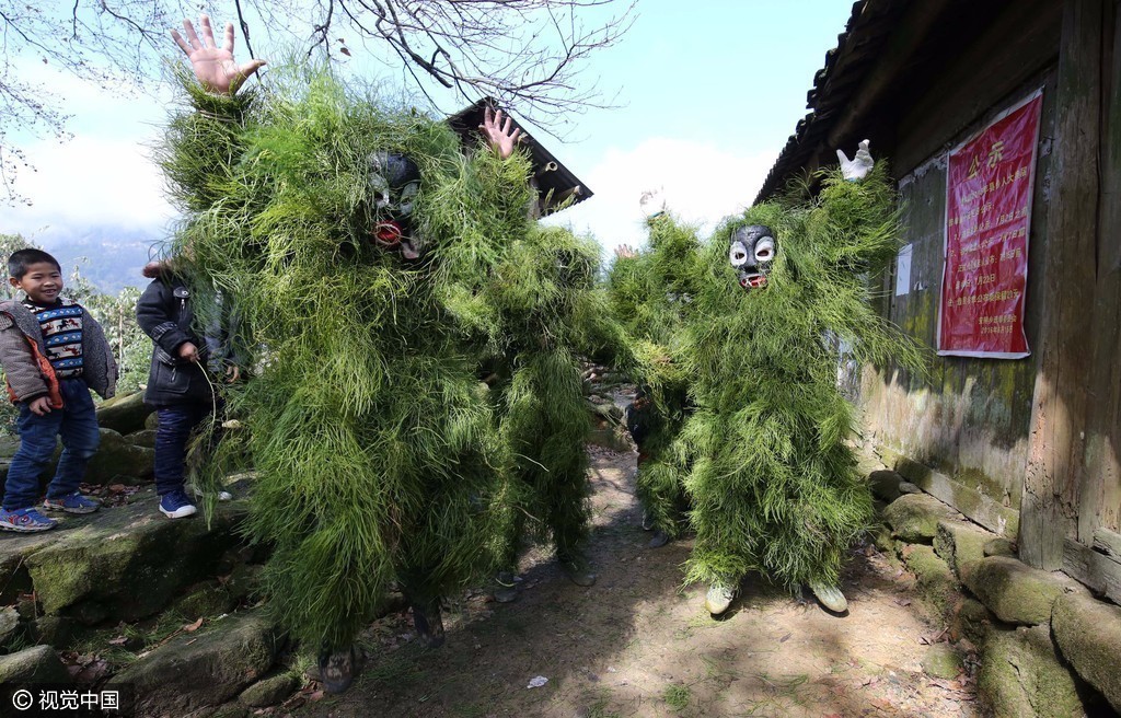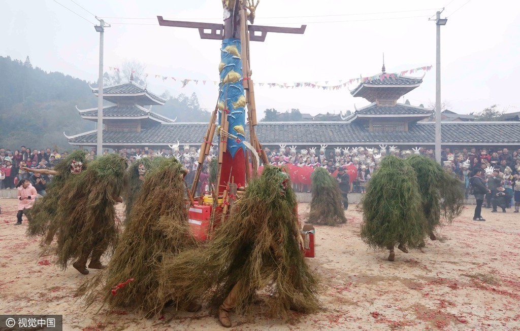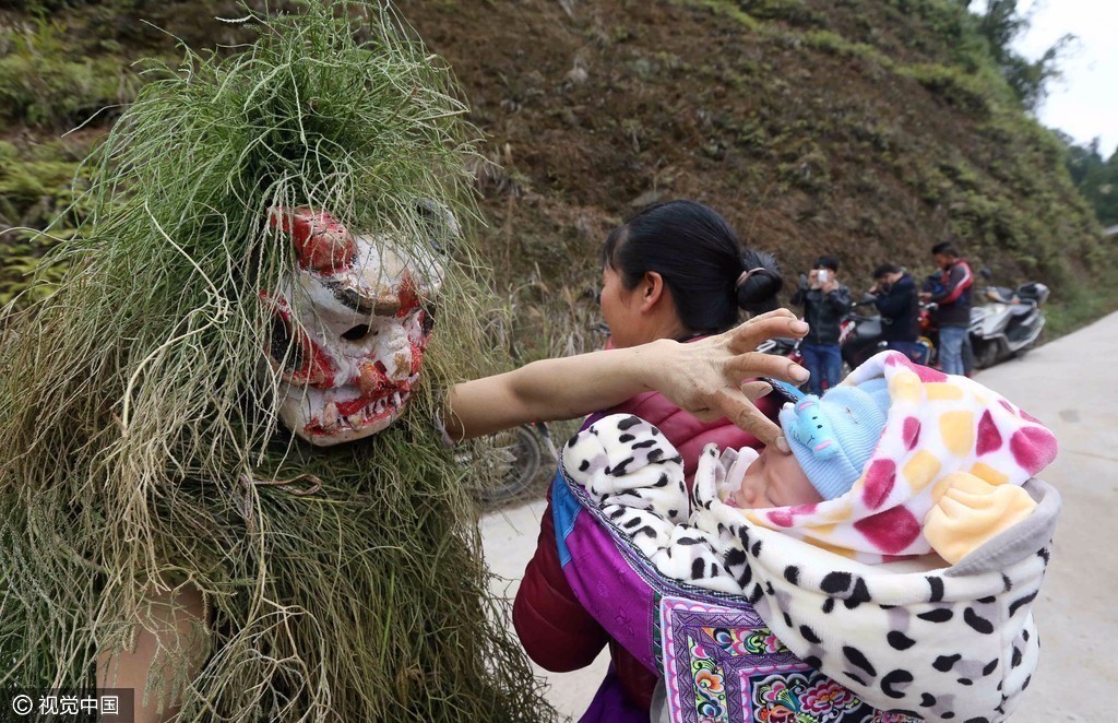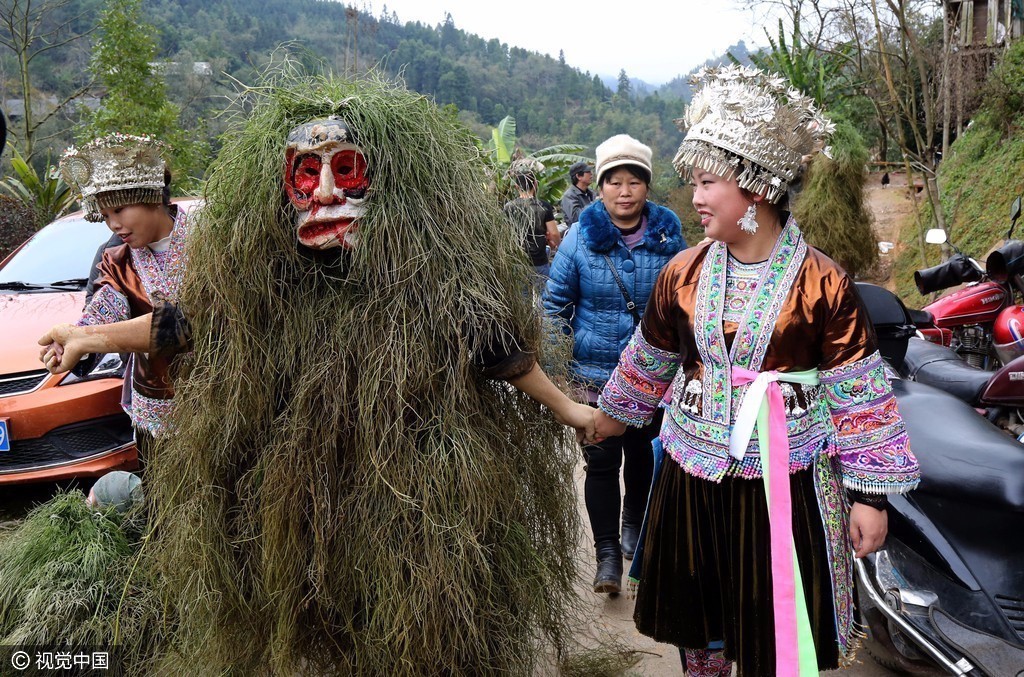 2017年2月5日农历正月初九,广西柳州的苗寨举行了传统的“芒篙节”。几十名苗族男青年装扮传说中的“芒篙”,给行人涂脸、摸头。