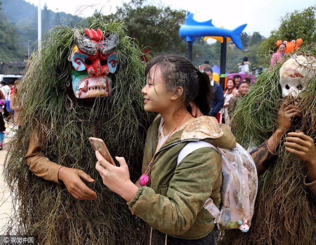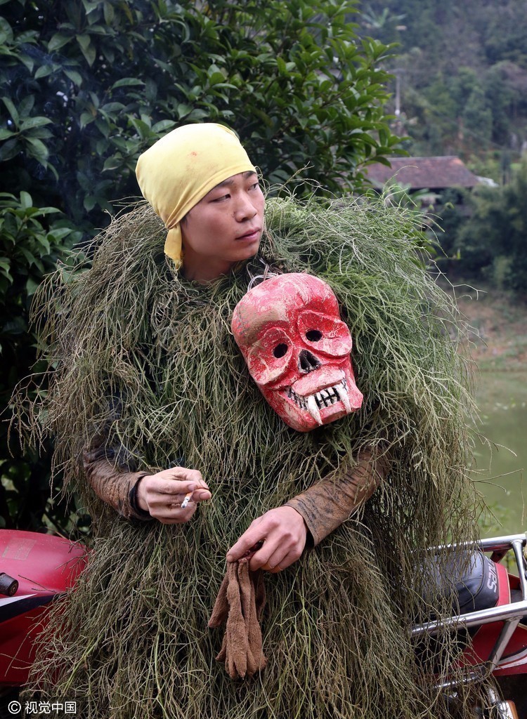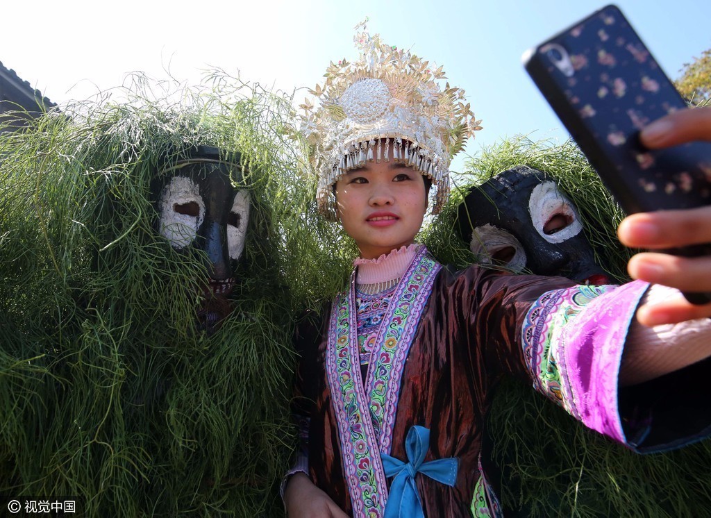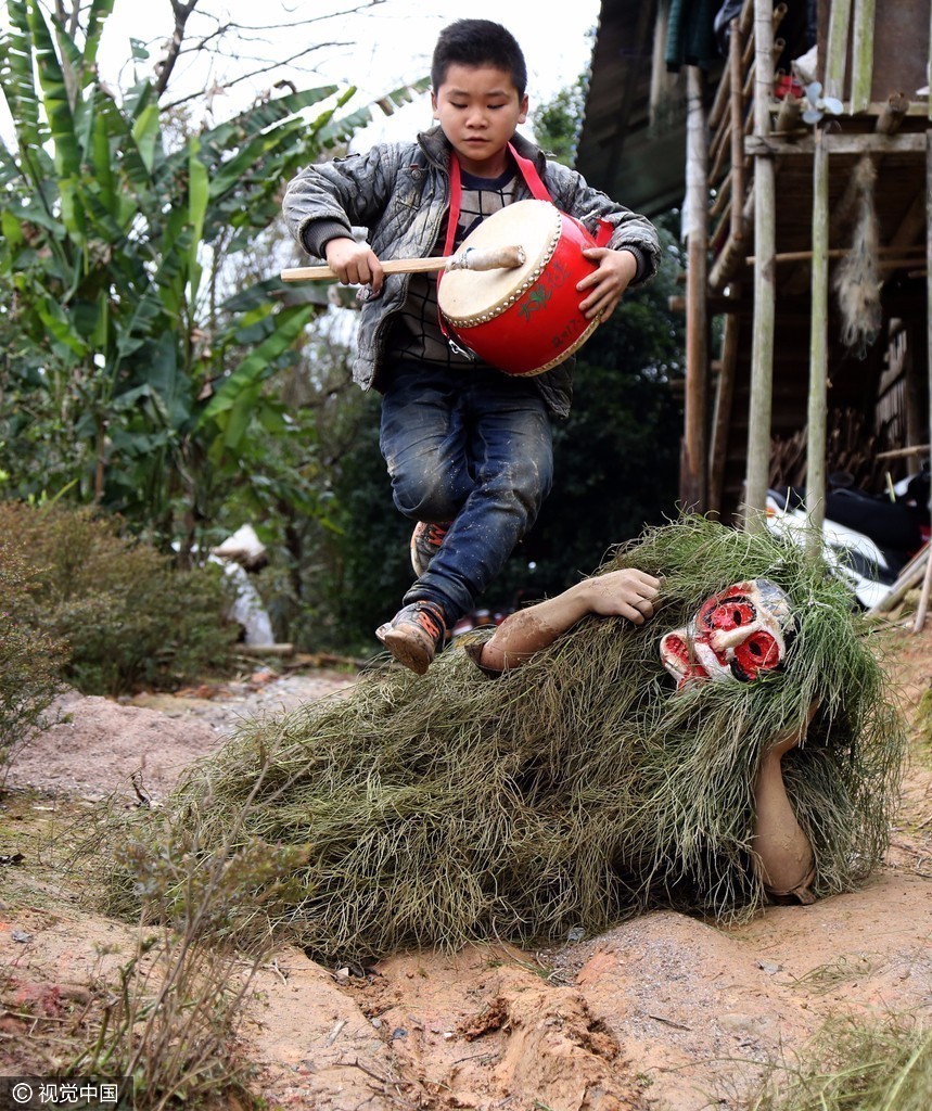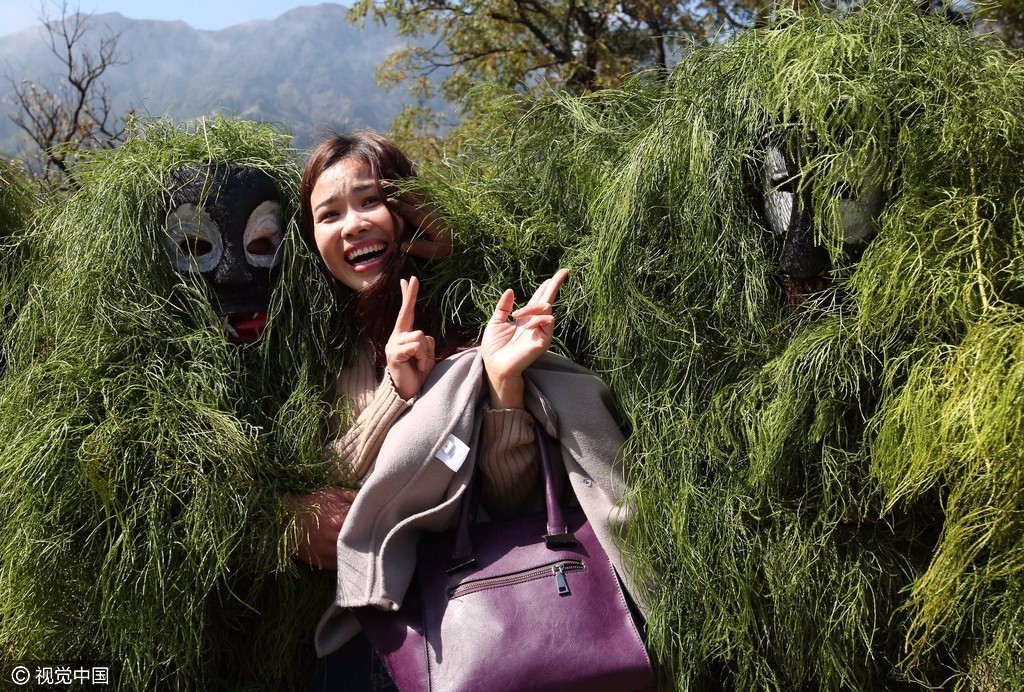 2017年2月5日农历正月初九,广西柳州的苗寨举行了传统的“芒篙节”。几十名苗族男青年装扮传说中的“芒篙”,给行人涂脸、摸头。