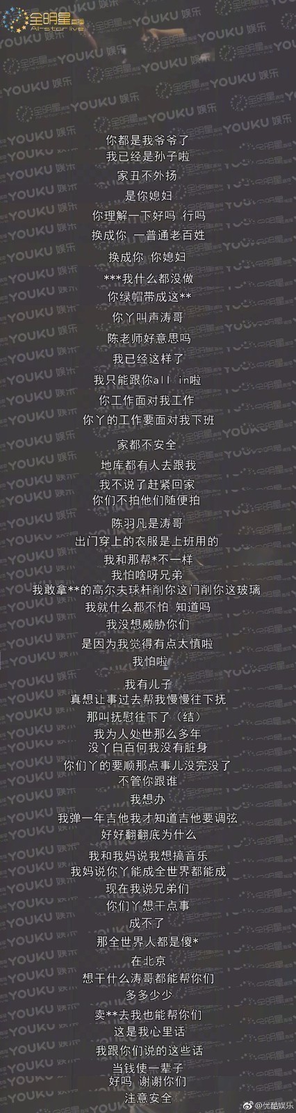 5月10日中午,据全明星直播曝料,陈羽凡酒后吐真言:“绿帽都戴成那样了”、“没有白百何,就没有脏身”,感觉十分无奈、委屈。