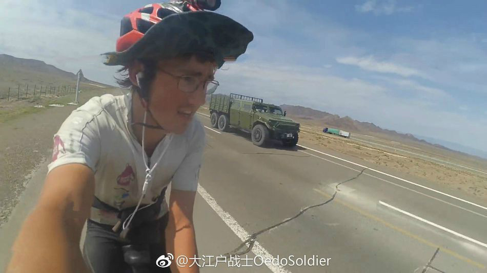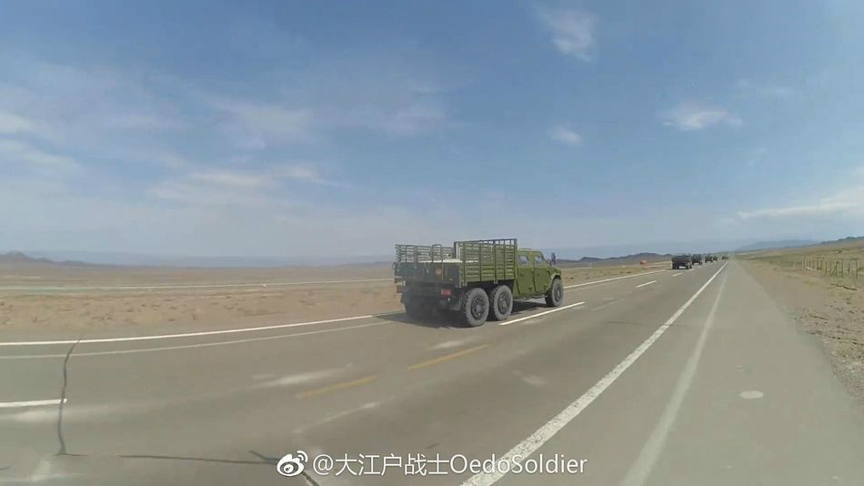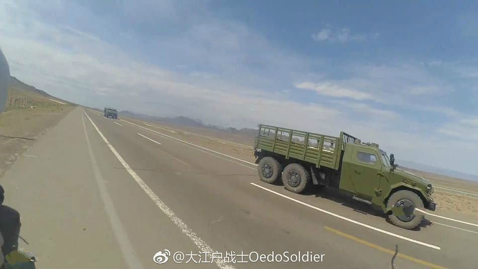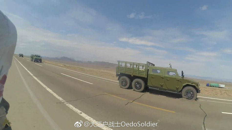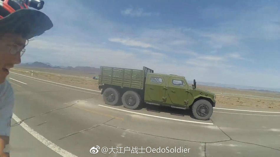 一个外国人在国道G30新疆段骑行的自拍视频,3分钟处出现新款猛士底盘的装甲运输车,半卡车型,有二门和四门两种型号。