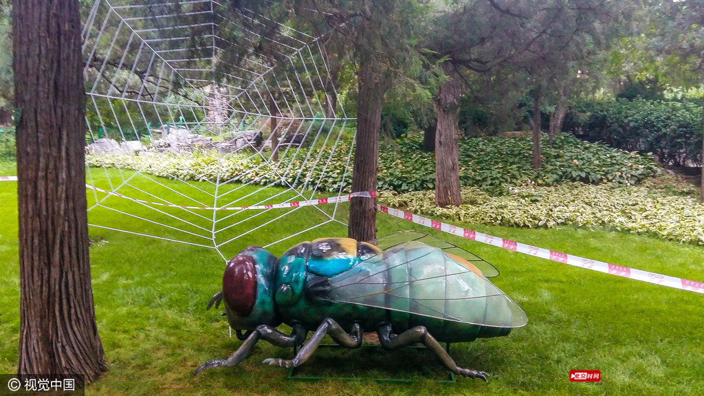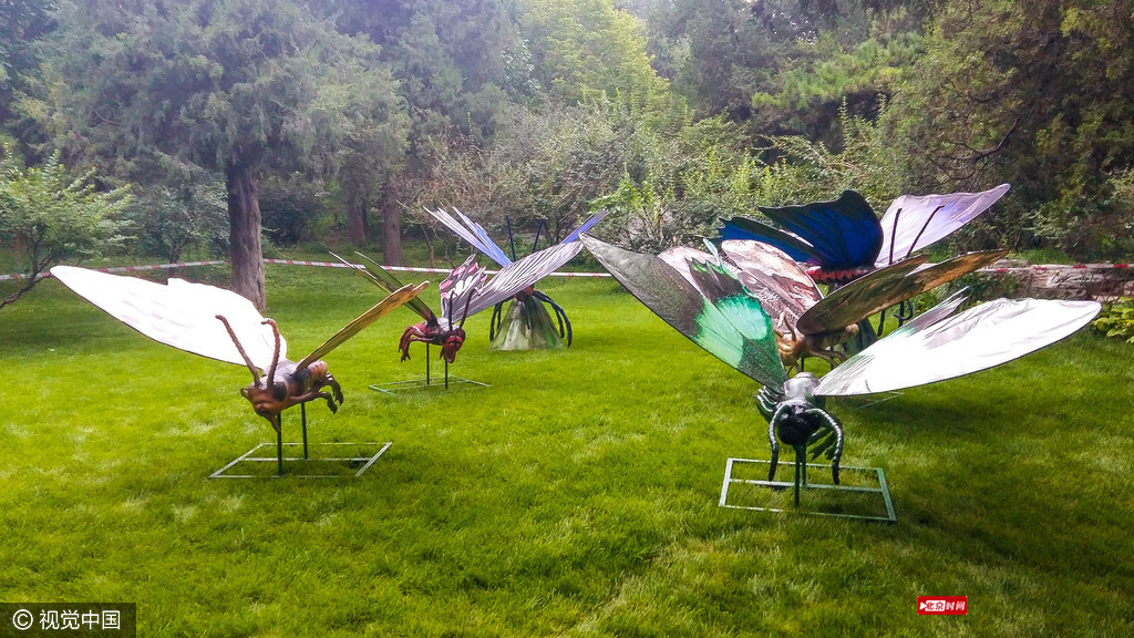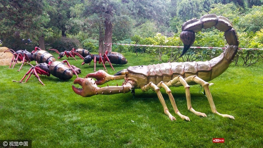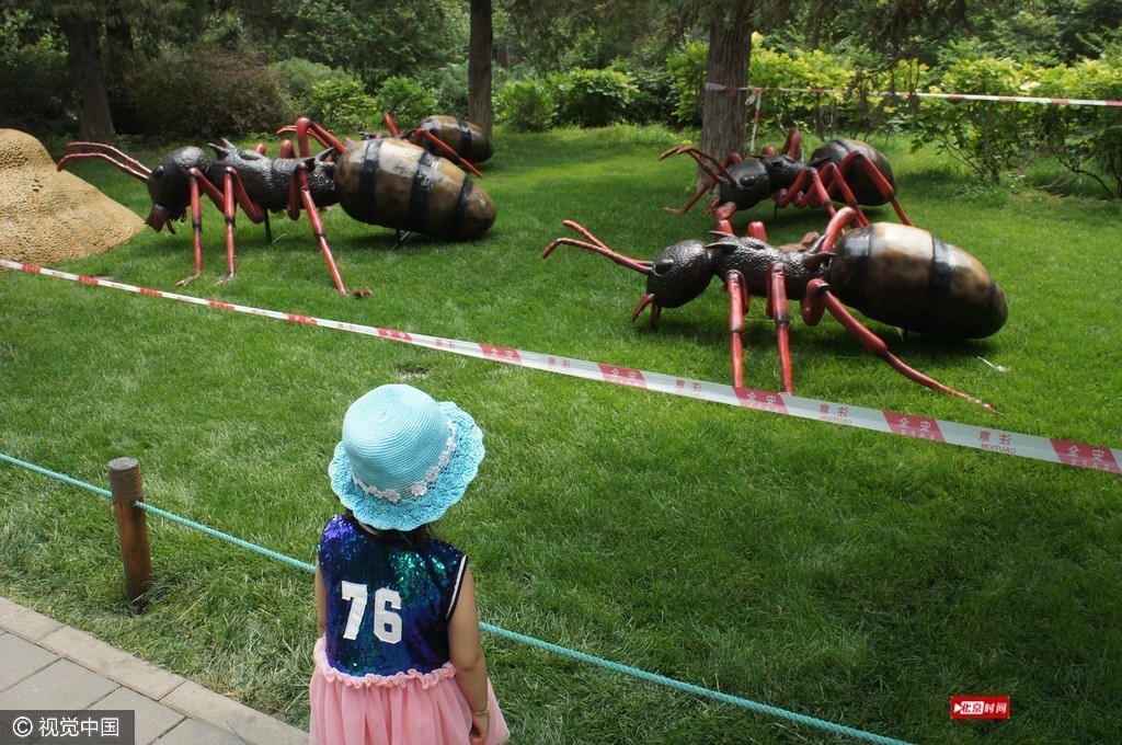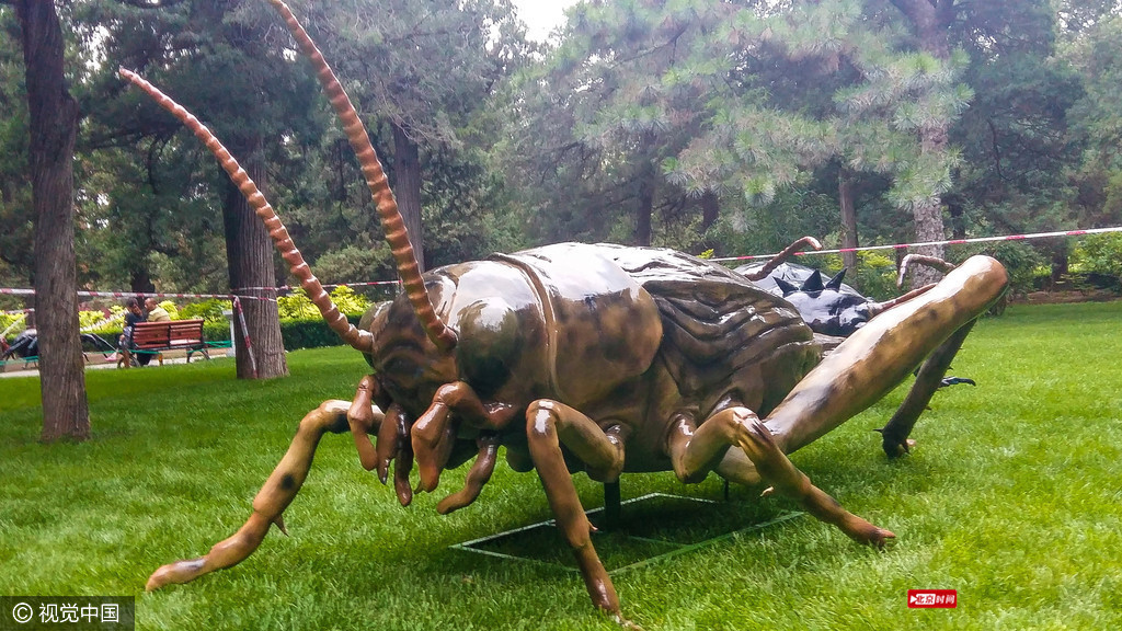 数十种仿真昆虫出现在北京景山公园的绿草地上,为暑期的孩子带来认知大自然中昆虫世界的乐趣。