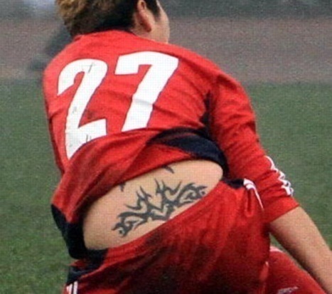 女足中场大将李影,在13年女足国际邀请赛上摔倒在地时露出这个纹身,是一个张开的翅膀,类似男足球员郜林的纹身,但是李影的腰间纹身,还是很时尚,很新潮的。