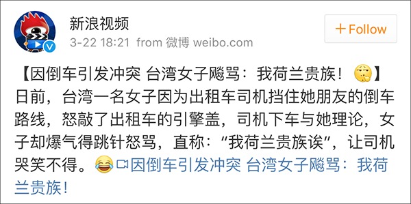 一名台湾女子和出租车司机因倒车问题在街边发生口角,女子气得疯狂怒骂,大呼:"我河南贵族",让司机哭笑不得。