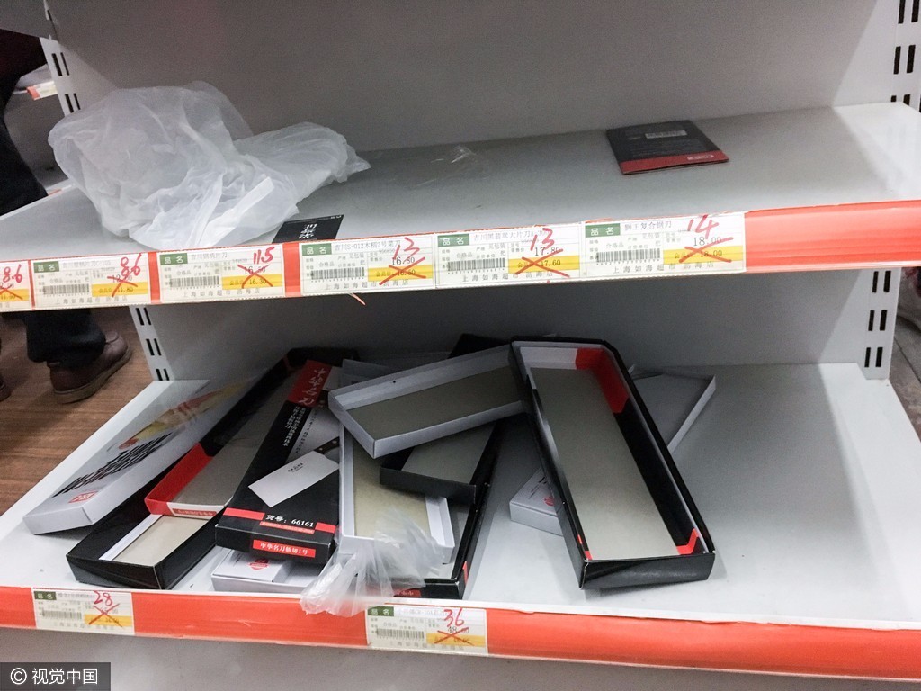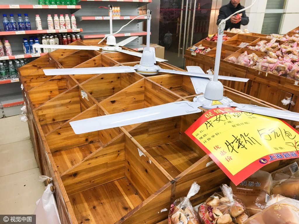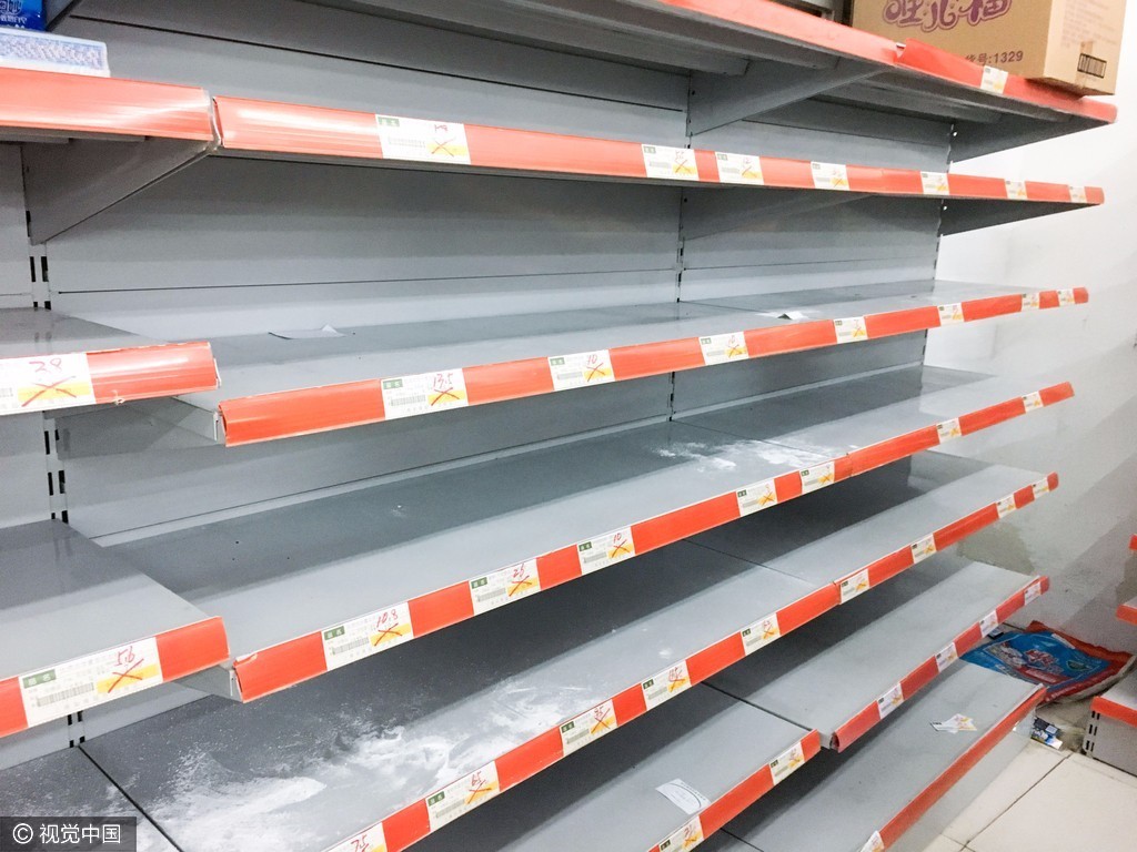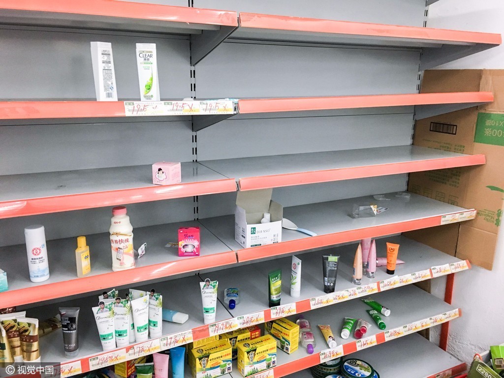 2017年3月11日,在浙江省绍兴市上虞区一个乡镇的超市内,众多货架上的商品被抢购一空,超市内众多地方凌乱不堪,像是经历了“劫后余生”。