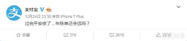 昨天深夜,支付宝官方微博发布了一条消息,顿时将大家平安夜的欢乐气氛拉回了现实:“过完平安夜了,年账单还会远吗?”