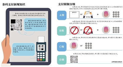 二维码支付迎监管,央行发布条码支付新规,明确支付机构提供条码支付服务必须持牌经营,将对条码支付额度进行分级管理。