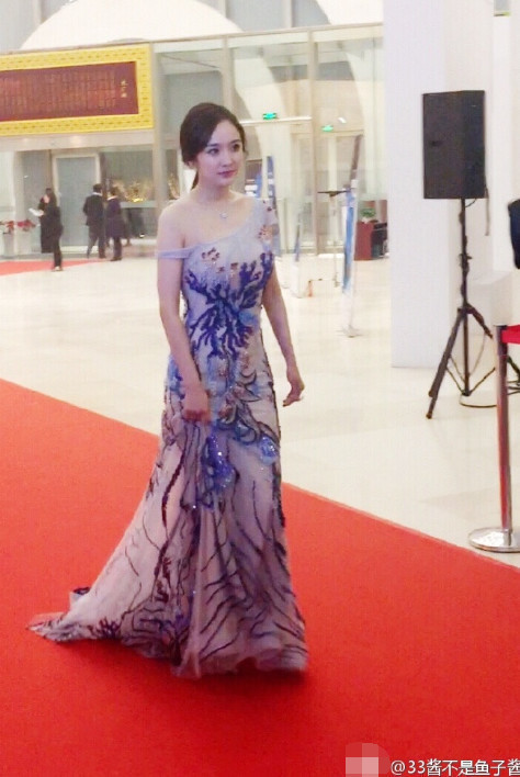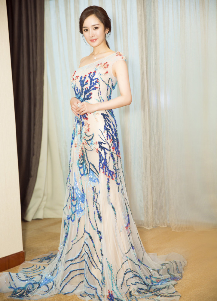 照片中, 杨幂穿着裸色绣花礼服,性感撩人,完美身材全部展露,辣妈身材颜值依然少女。