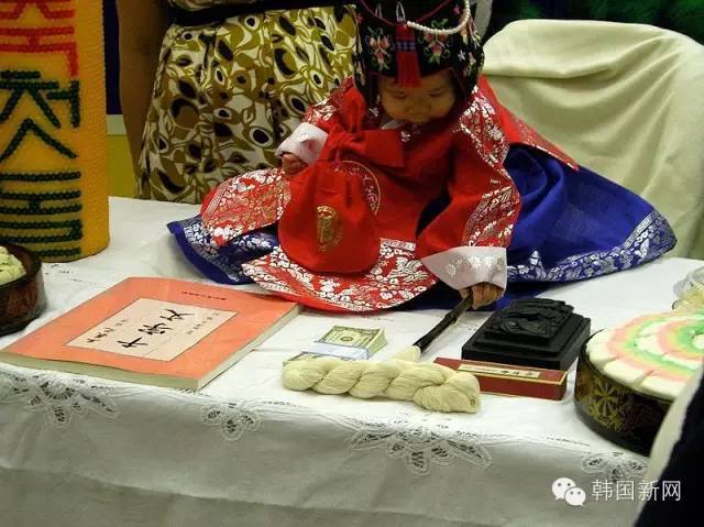 在满周岁的那一天,孩子的父母就通过举行周岁宴的方式来庆贺孩子度过了人生的第一道关卡,并且祝福孩子能够平安成长。周岁宴上,最有意思的环节就是抓周了。抓周在韩国叫“돌잡이”。与中国一样,孩子抓到了什么,以后就有可能成为什么样的人。以前的抓周,孩子面前会有笔、书、纸币等物品。抓住了书或者笔,就意味着孩子会成为一名学者抓住了纸币,就意味着孩子会成为有钱人。
